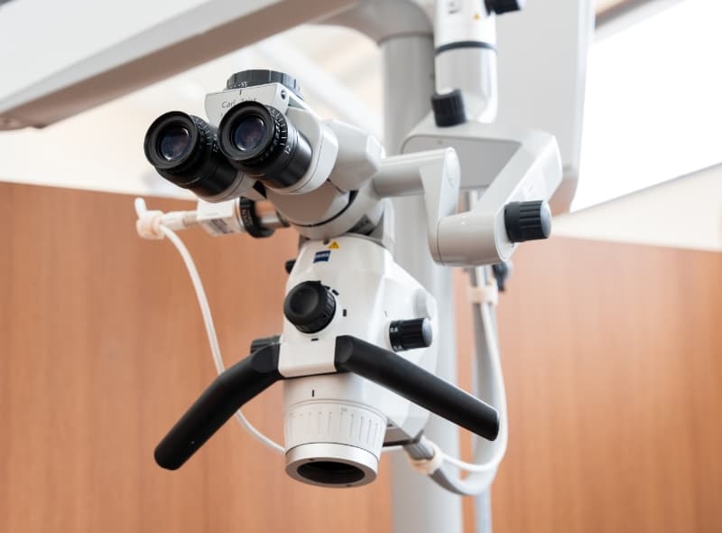 マイクロスコープは、最大20倍まで拡大可能な歯科用顕微鏡です。高倍率ルーペよりもさらに詳細な観察が可能で、微小なむし歯の除去や、難易度の高い根管治療に活用されています。当院のマイクロスコープは、高解像度のデジタルカメラを搭載しているため、リアルタイムで撮影した画像をモニターに表示することができます。