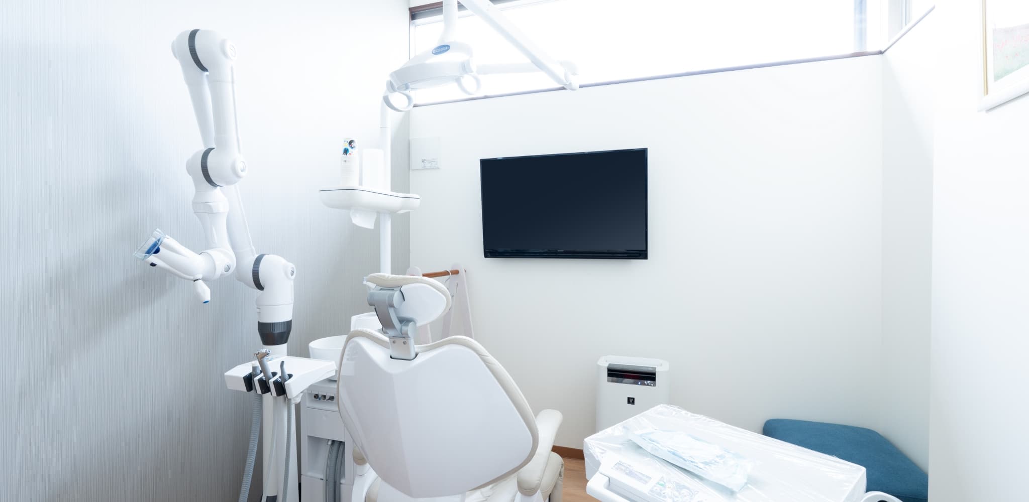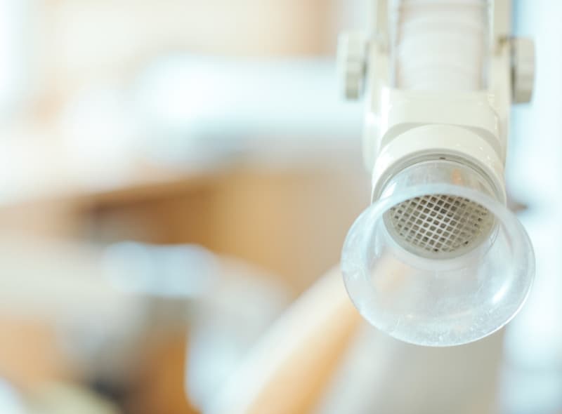 歯を削ったり、歯石を除去するときに、唾液や細菌のまじったマイクロエアロゾルとよばれる細かな粒子が発生します。このマイクロエアロゾルが飛散するのを防ぐため、口腔外バキュームを活用します口腔外バキュームを使用することにより、院内感染の危険性を下げることができます。