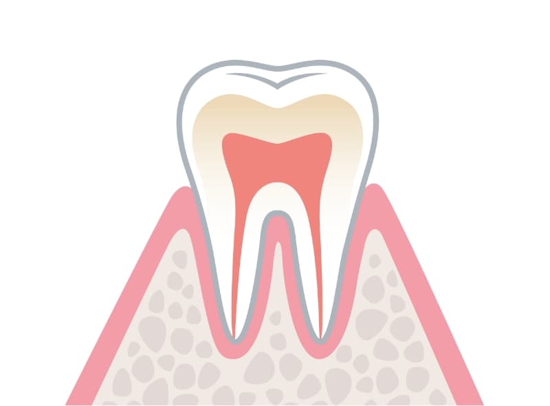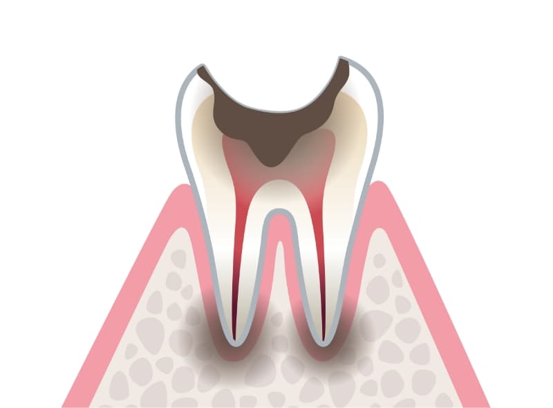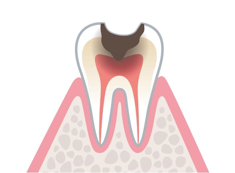 むし歯が象牙質まで到達すると、神経に近い部位まで細菌が侵入します。象牙質は神経との距離が近いため、温度変化などの刺激で痛みを感じやすくなるのが特徴です。この段階では、むし歯を除去し、適切な詰め物や被せ物で歯を保護しなければなりません。症状によっては、神経の除去(抜髄)が必要になるケースもあります。